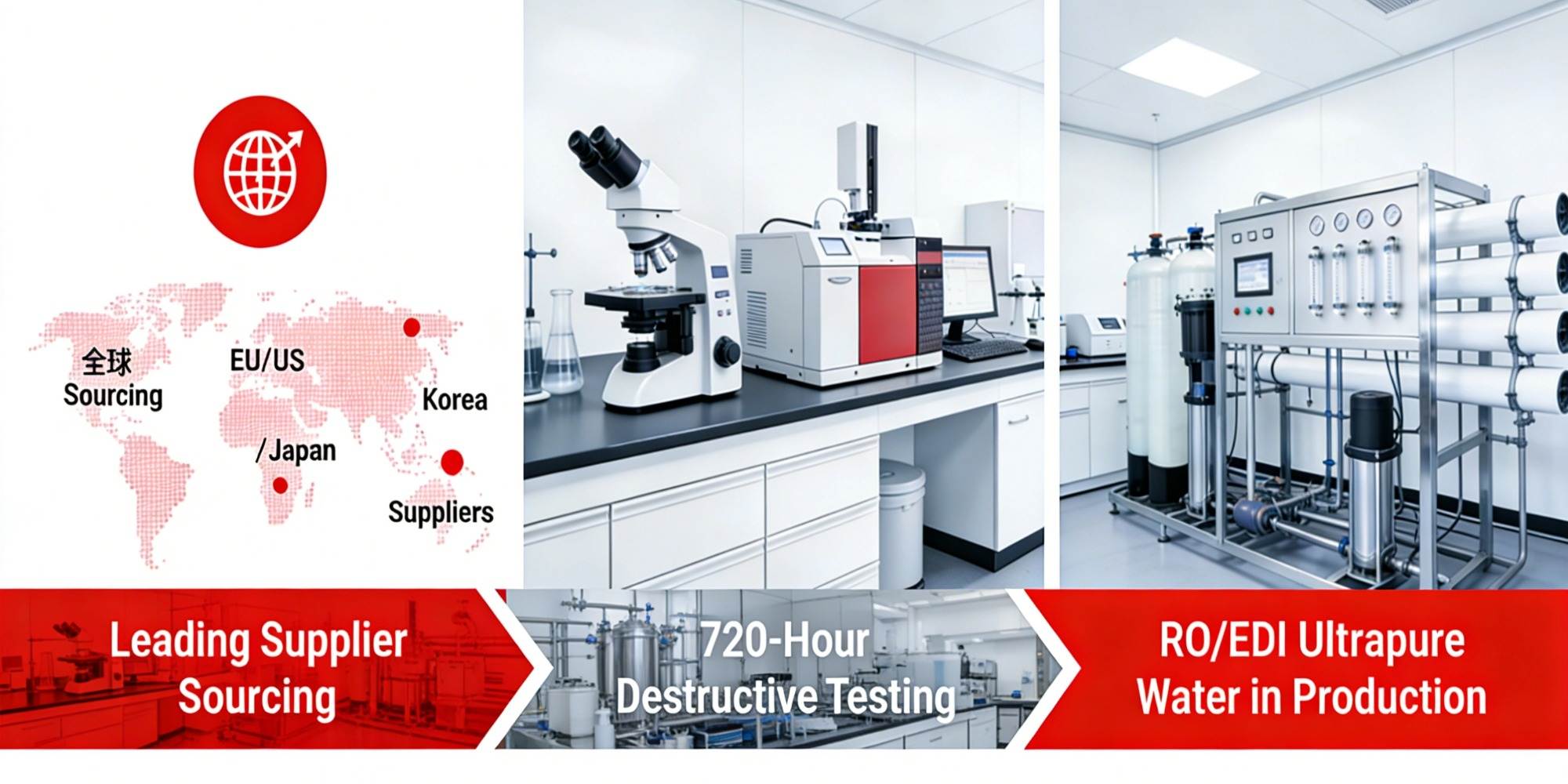 من خلال التوريد العالمي من كبار الموردين في الاتحاد الأوروبي/الولايات المتحدة/اليابان/كوريا، والمختبرات الداخلية التي تجري اختبارات مدمرة لمدة 720 ساعة، والمياه فائقة النقاء بتقنية التناضح العكسي/إزالة الأيونات الكهربائية في جميع مراحل الإنتاج، نضمن جودة المواد الخام وسلامة المنتج واستقرار التركيبة.