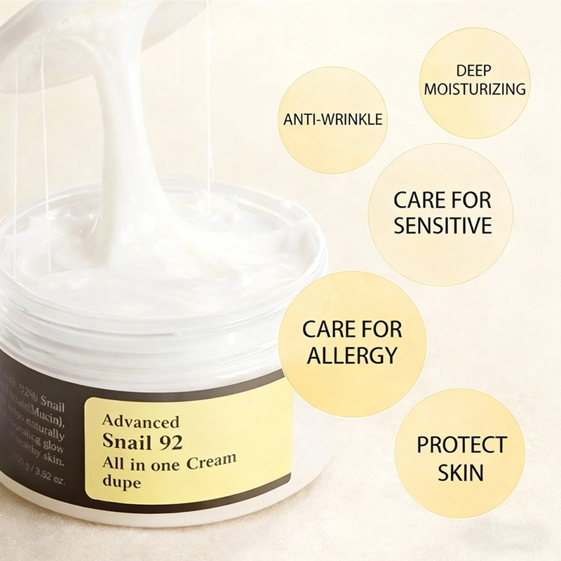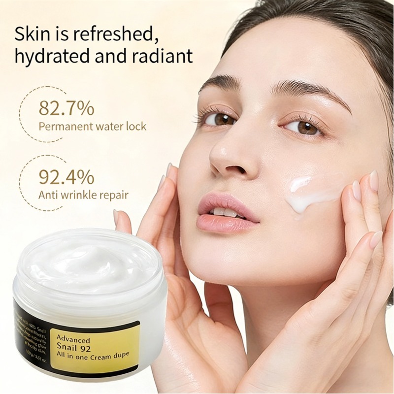 كريم الحلزون المتطور 92 متعدد الاستخدامات مصمم خصيصًا لترطيب البشرة بعمق ومكافحة علامات التقدم في السن. يعمل مستخلص الحلزون بنسبة 92% على إصلاح وتغذية البشرة الجافة، بينما يضمن قوامه الخفيف امتصاصًا سريعًا دون أي ملمس دهني، ليمنحكِ شعورًا بالراحة يدوم طويلًا. يحبس الكريم الرطوبة في أعماق البشرة، ويملأ الخطوط الدقيقة، ويعيد إليها نضارتها وإشراقتها الشبابية. مثالي للاستخدام اليومي، فهو يحوّل البشرة الجافة والباهتة إلى بشرة رطبة وصحية مع كل استخدام.
