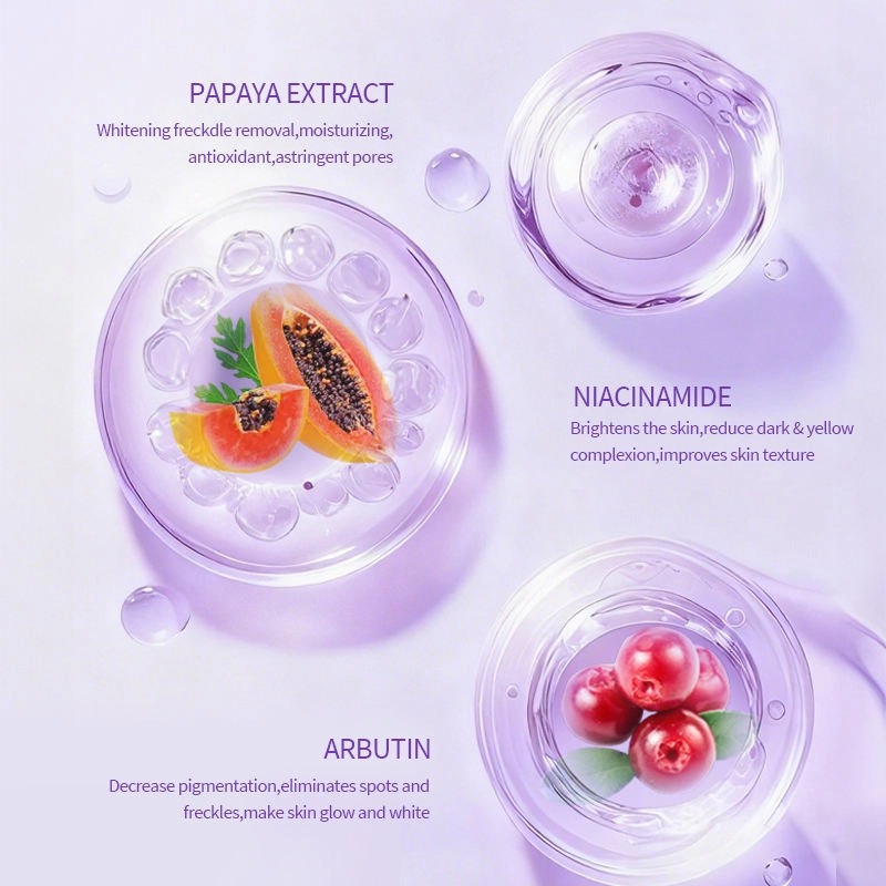 مستخلص البابايا: يبيض البشرة، ويخفف النمش، ويرطبها، ويوفر حماية مضادة للأكسدة، ويشد المسام.
